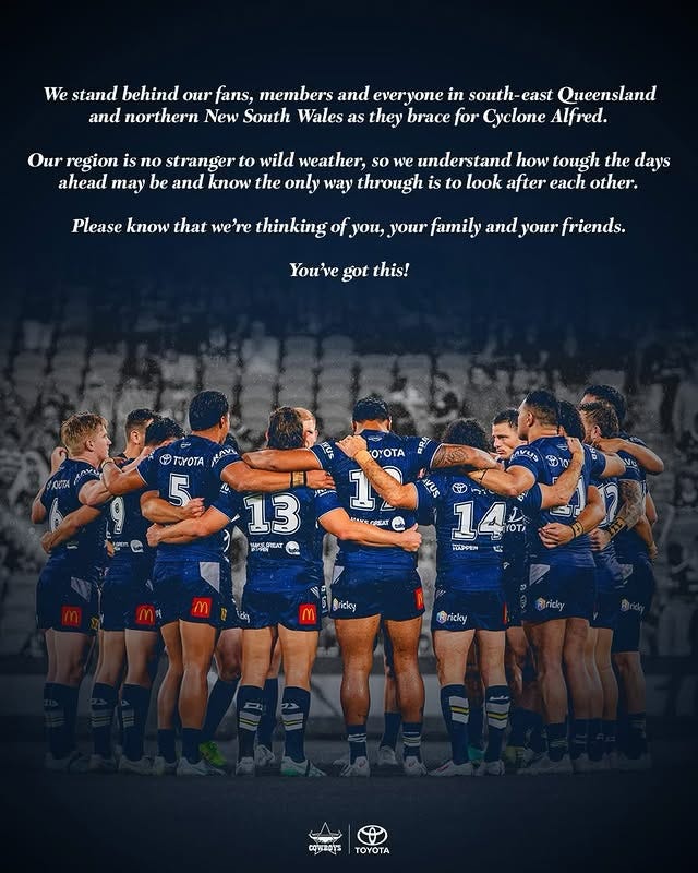 Severe Tropical Low Alfred ended up postponing the entire first round of Queensland Cup. The Hunters and Tigers couldn't transit through Brisbane airport and the rest of the games were in the (mostly poorly drained) firing line of the former cyclone. The QRL left it to up to clubs to postpone games, much in the same way the state government left a lot of decisions up to individuals or schools or councils. Some of that reflects high variability of local conditions and some of that reflects that no one, anywhere, wants to be the one responsible for loss of revenue.