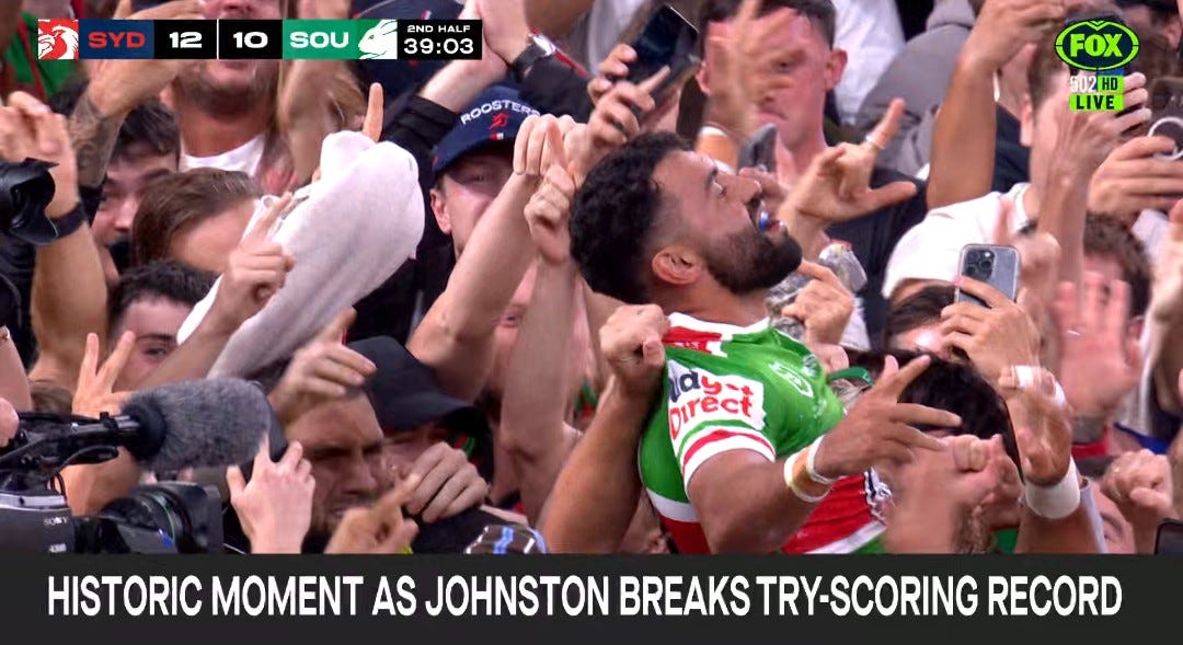 As South Sydney’s Alex Johnston raced away to score his record breaking try and become the greatest try-scorer Australian rugby league has ever known and maybe will ever know, the feet were already moving.