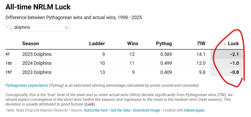 In three seasons, the Dolphins have underperformed their Pythagorean expectation by a total of four wins. If they had played to anywhere near the level of talent suggested by their ability to score points, the Dolphins would have been in the running for a finals spot in 2024 and would have replaced the Roosters in the post-season of 2025. In fact, the miss in 2025 is in the top decile of biggest misses in NRL history.